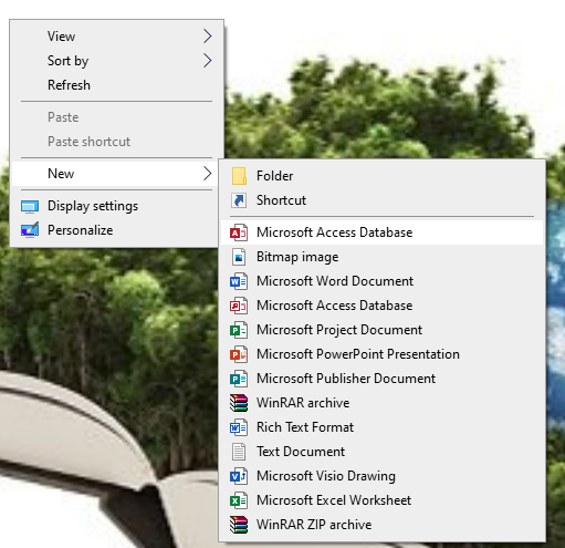 یک راه ساده برای ایجاد یک سند یا بانک اطلاعاتی اکسس، ایجاد یک سند از نوع Access است. با کلیک راست در محلی که میخواهید فایل بانک اطلاعاتی را ایجاد کنید، فهرست دستورات را ظاهر کنید. با انتخاب گزینه Microsoft Access فایل جدیدی ایجاد و نامگذاری کنید. با اجرا کردن این فایل، پرونده پایگاه داده از نوع اکسس باز شده و تنظیمات مورد نظر را از شما درخواست میکند.